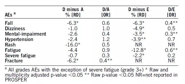 结论:调整试验变异后,D在跌倒、头晕、精神障碍、高血压、皮疹、疲劳和骨折事件方面表现出良好的安全性。