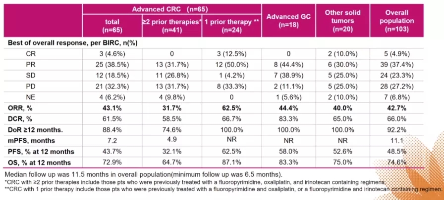 研究者评估也发现了类似的结果:整体人群中ORR为41.7%。在结直肠癌患者中,一线治疗失败患者中ORR为58.3%,≥2线治疗失败患者中ORR为29.3%。胃癌患者中ORR为50%,其他肿瘤患者的ORR为40.0%。