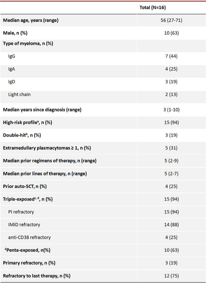 本研究自2019年9月至2020年4月在国内的6家中心总计入组16例复发难治性多发性骨髓瘤(RRMM)(中位年龄56岁,27-71岁),要求患者既往治疗至少≥2线或对蛋白酶体抑制剂PI及免疫调节剂IMiD呈现双重耐药的难治患者。入组患者的基线特征见表1,既往治疗线数为5线(2-7线),对PI或IMiD难治比例分别为94%和88%,25%接受过CD38单抗治疗,25%接受过自体干细胞移植,原发难治占19%,末线治疗难治占75%;细胞遗传学高危者占94%,双打击患者占19%,合并髓外病变者占31%。CART细胞回输量分为3个剂量水平:1x105/kg (DL1) (1例),2x105/kg (DL2) (9例) and 3x105/kg (DL3) (6例) ,均为单次回输。