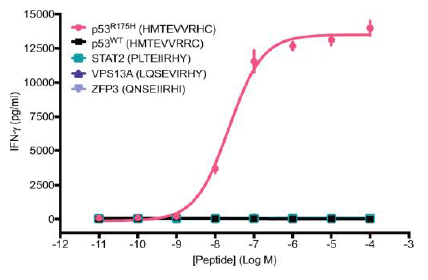 TP53R175H突变(175号密码子由精氨酸替换为组氨酸)是最常见的TP53突变,也是所有肿瘤抑制基因中最常见的突变。TP53R175H突变编码的p53R175H蛋白被蛋白酶体降解成多肽(HMTEVVRHC),并可与特定的HLA等位基因(HLA-A*02:01)结合,从而在细胞表面上形成肽-HLA复合物(p53R175H/HLA-A*02:01)被T细胞识别并杀伤。研究者利用质谱分析法确证了该复合物在三种人肿瘤细胞株(KMS26、TYK-nu和KLE)膜表面的共表达。因此,p53R175H/HLA-A*02:01复合物是一个泛癌种的理想治疗靶点。