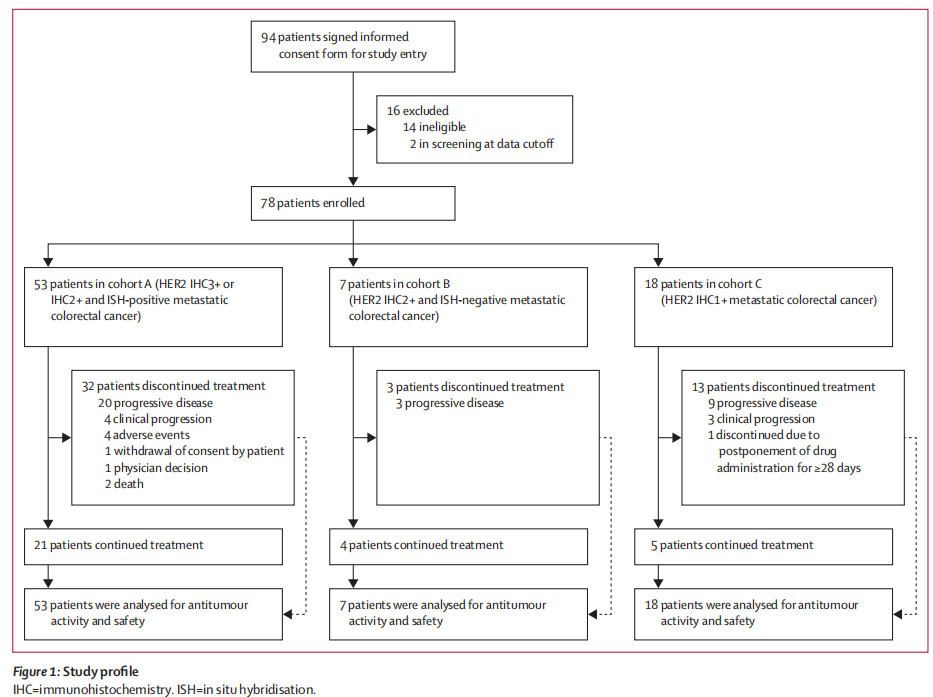 根据HER2表达水平将患者纳入三个队列之一:队列A(HER2阳性,免疫组织化学[IHC]3+或IHC2+和原位杂交[ISH]阳性),队列B(IHC2+和ISH阴性),队列C(IHC1+)。患者每3周静脉内接受6.4 mg/kg DS-8201,直至疾病进展、出现不可接受的不良事件、撤回同意或死亡。主要终点是队列A中通过独立中央审查确认的客观反应率,该审查在完整分析集中进行评估,安全性在安全分析集中进行评估。完整分析集和安全性分析集均包括所有接受一次或多次DS-8201治疗的患者。