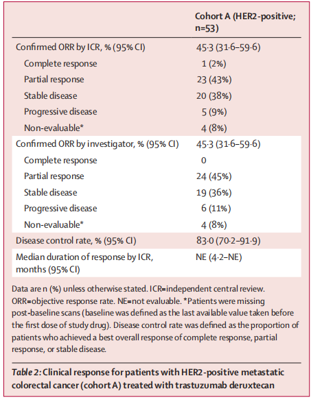 图2. HER2阳性转移性结直肠癌患者使用曲妥珠单抗治疗的临床反应率(队列A)