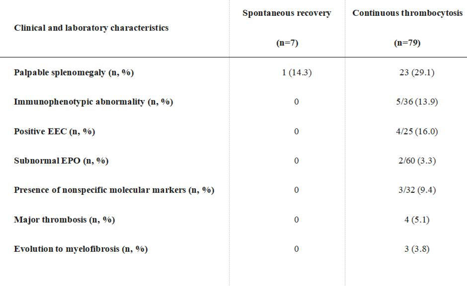 表1. 自发缓解患者及血小板持续增高患者的临床及实验室特点比较