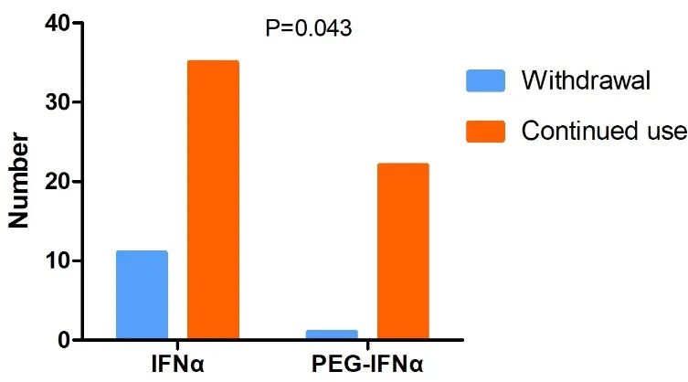 图4. 普通干扰素与聚乙二醇干扰素在儿童ET中的耐受性比较