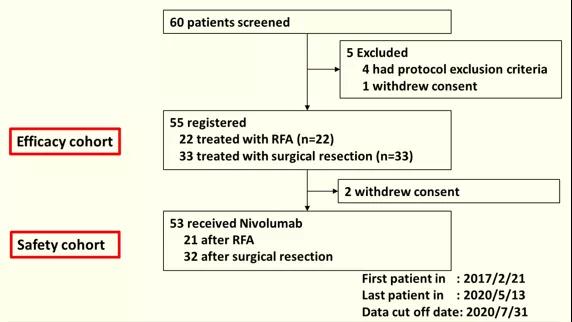 值得一提的是,在今年ASCO年会上,日本近畿大学医学院附属医院院长Masatoshi Kudo教授报告了一项手术切除(SR)或射频消融术(RFA)后辅助使用纳武利尤单抗(Nivolumab)治疗肝细胞癌的II期前瞻性多中心单臂试验(Masatoshi Kudo, et al.2021 ASCO Abstract 4070),该研究评估纳武利尤单抗作为肝癌术后辅助治疗的有效性和安全性,并确定了手术切除(SR)或射频消融(RFA)后预测患者复发的生物标志物。研究共纳入53例肝癌患者(图3),这些患者在SR或RFA后显示出完全缓解。在SR或RFA后6周内所有患者接受了纳武利尤单抗治疗 (240 mg,每2周一次,持续8个周期,随后改为480 mg,每4周一次,同样持续8个周期)。主要终点为1年无复发生存率(RFSR),关键的次要终点是无复发生存期(RFS)。探索性生物标志物分析包括肿瘤组织中的突变、拷贝数改变和肿瘤突变负担。
