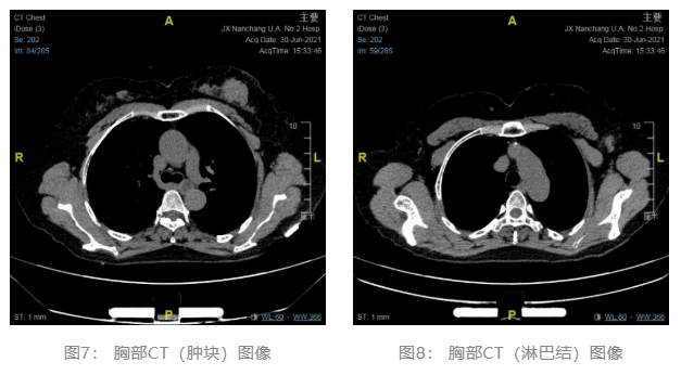 2021.06.30 胸部CT平扫:1.左乳占位伴左侧腋窝区肿大淋巴结 2.双肺未见明显异常(图7、8)