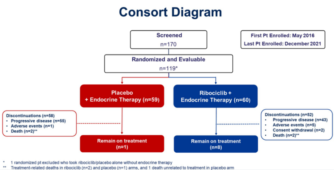 Kevin Kalinsky教授:MAINTAIN研究是一项随机对照试验,研究入组对象为HR+/HER2-晚期乳腺癌患者,这些患者至少都经过一种CDK 4/6抑制剂治疗和任何一种内分泌治疗后出现疾病进展。该研究共入组了120例患者,并将患者按照1:1比例进行分配,给予内分泌联合瑞博西利(ribociclib)治疗或内分泌联合安慰剂治疗。