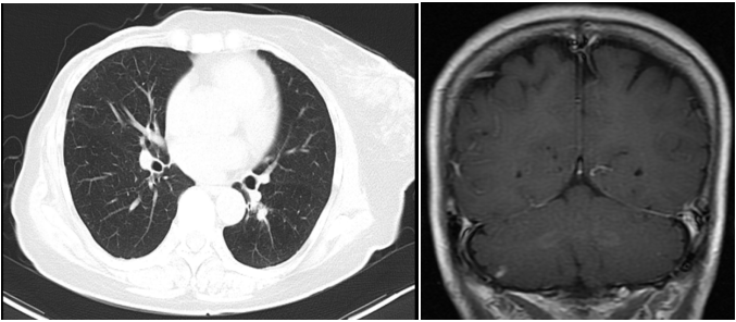 ④三线治疗:曲妥珠单抗(汉曲优) 300mg Q3W+吡咯替尼 320mg QD+唑来膦酸4mg Q3M,并予以局部区域放疗。维持治疗至2022.03.31出现新发左肺转移灶及右侧小脑转移灶。行支气管镜检查,并取左肺下叶背段支气管开口见新生物活检,病理提示:(左肺结节)乳腺癌转移,Ki-67(20%,+),ER(-),PR(-),HER2(3+)。右侧小脑异常信号,1.2cm(图5),考虑转移。疗效评价PD,PFS 16个月。