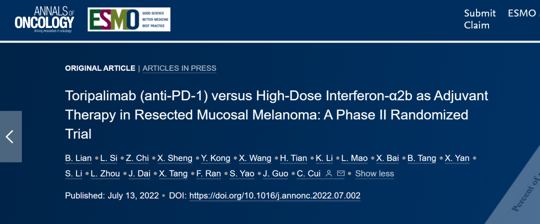 当地时间7月13日,ESMO官方期刊、国际肿瘤学顶级期刊Annals of Oncology(IF=52)在线发表了北京大学肿瘤医院郭军教授团队题为“Toripalimab (anti-PD-1) versus High-Dose Interferon-α2b as Adjuvant Therapy in Resected Mucosal Melanoma: A Phase II Randomized Trial”的文章,探讨了特瑞普利单抗对比高剂量干扰素(IFN)-α2b(HDI)用于黏膜黑色素瘤术后辅助治疗的疗效和安全性,这项研究曾入选2021年ASCO大会壁报交流。文章的通讯作者为崔传亮教授,第一作者为连斌副教授。