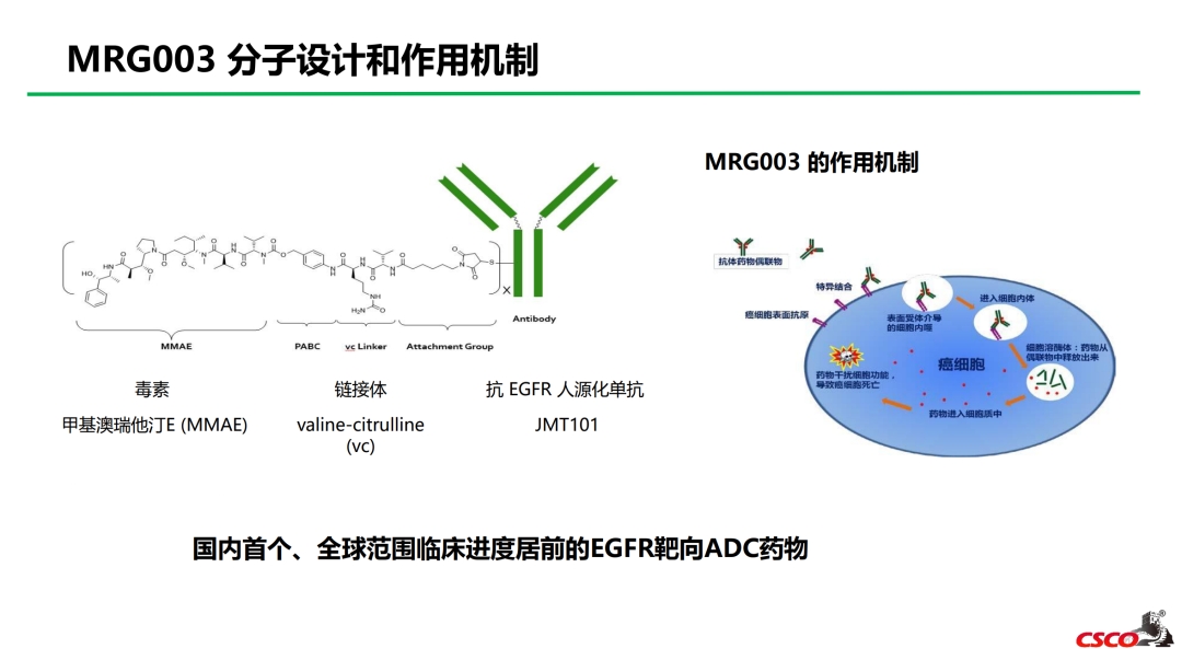 2022年11月12日,CSCO学术年创新药物临床研究数据专场中,在CSCO大会主席、中山大学肿瘤防治中心徐瑞华教授的主持下,中山大学肿瘤防治中心韩非教授发布了题为《MRG003,a novel EGFR-targeted antibody-drug conjugant(ADC)for recurrent/metastatic Nasopharyngeal Carcinoma)》的重要报告,展现了我国自主研发的新型抗体偶联药物(ADC)药物的突破性成果,在海内外引起巨大关注。