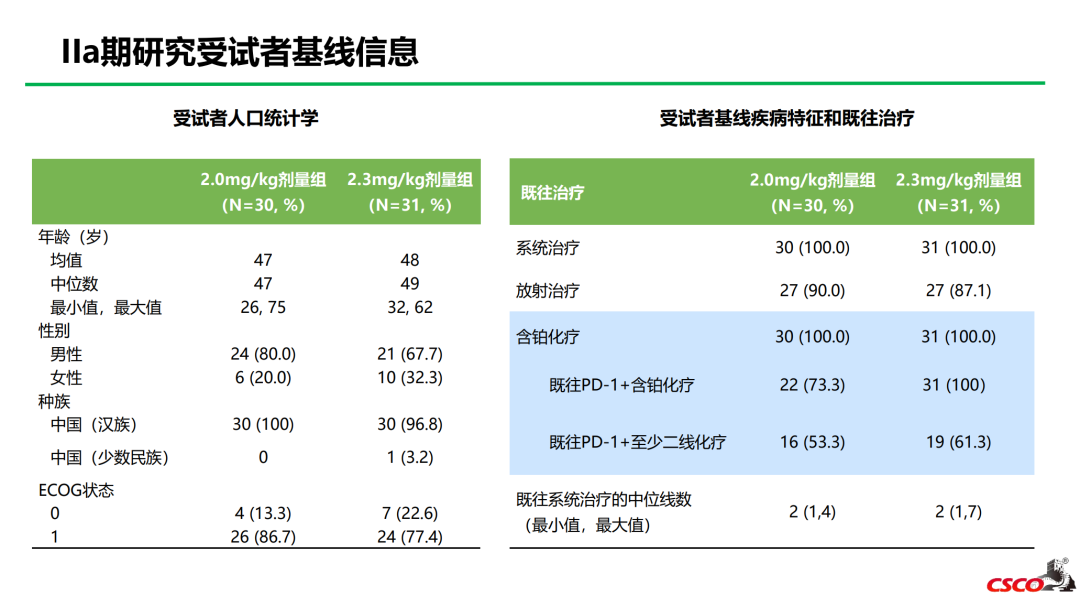 在MRG003-005研究的Ⅱa期疗效探索阶段,截止2022年6月8日,共入组了61例中国患者,其中MRG003 2.0mg/kg组30例,2.3mg/kg组31例,EGOG 0-1分,既往系统中位治疗线数为2线,均接受过含铂+PD-1方案,约90%的患者接受过放疗。研究结果显示:在有效性分析集的57例受试者中,总体ORR为47.4%,DCR为79.0%,3个月DoR率为90%;其中2.0mg/kg剂量组28例,ORR为39.3%,DCR为71.4%,2.3g/kg剂量组29例,ORR为55.2%,DCR为86.2%;2.0mg/kg剂量组mPFS为6.3个月,3个月PFS率为62.3%;2.3mg/kg剂量组mPFS未成熟,3个月PFS率为88.7%。亚组分析显示,96.5%的受试者EGFR表达量为1+及以上,无论肿瘤组织EGFR表达量高低,MRG003均取得了良好的疗效。