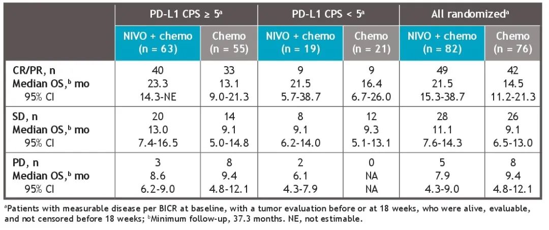 在18周时,两个治疗组中无论是PD-L1 CPS≥5还是<5,达到缓解的患者与疾病稳定(SD)或疾病进展(PD)的患者相比具有更长的中位OS(图6、表3)。
