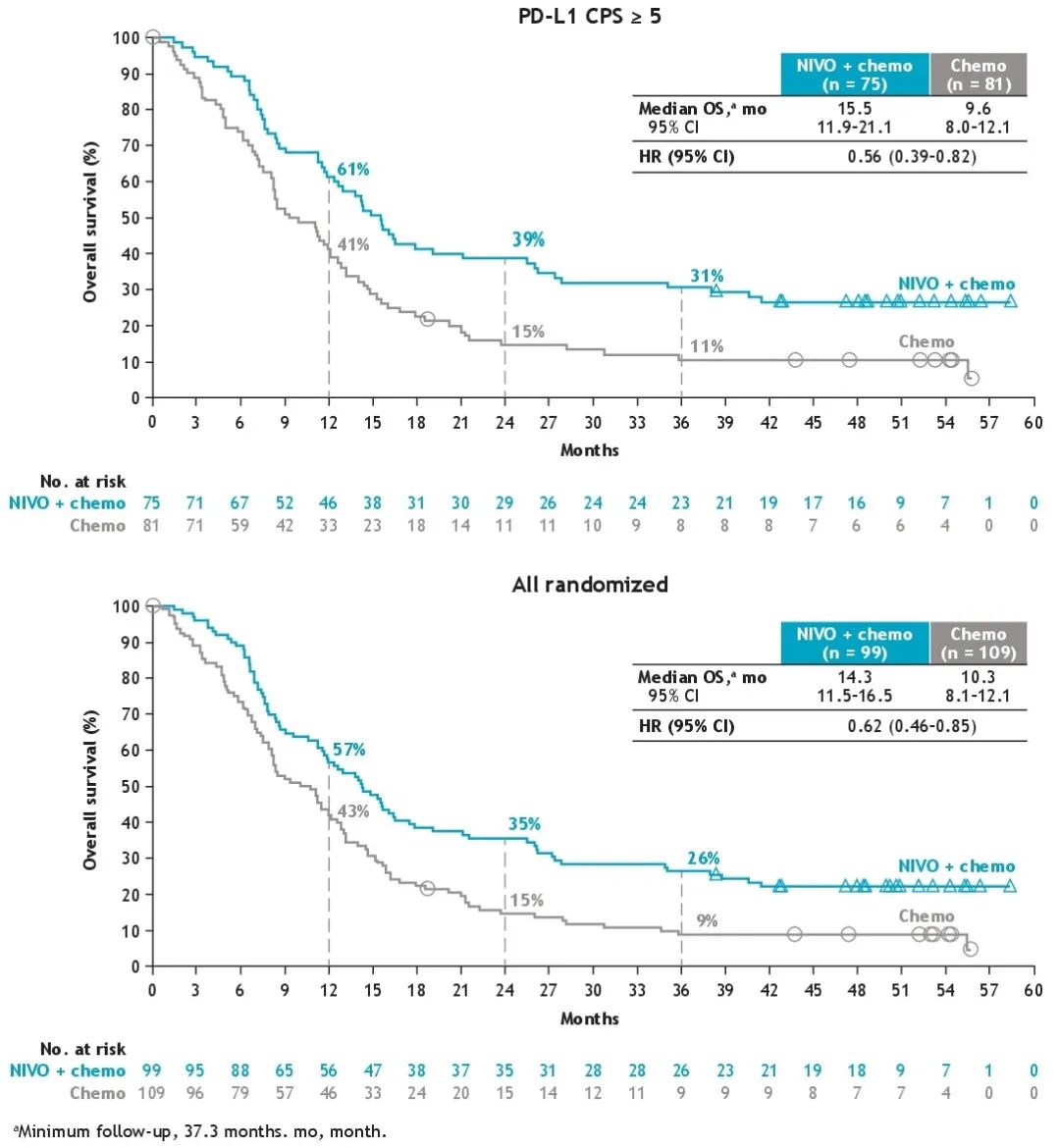 在PD-L1 CPS≥5患者中,NIVO+化疗组和化疗组的36个月OS率分别为31%和11%;在所有随机患者中,36个月OS率分别为26%vs.9%。