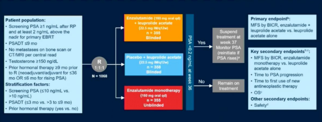 研究的主要终点是通过盲法独立中心(BIRC)评估的恩扎卢胺+亮丙瑞林对比亮丙瑞林的无转移生存期(MFS);关键次要终点包括恩扎卢胺单药对比亮丙瑞林的MFS,至PSA进展时间、至首次使用新抗肿瘤药物时间、总生存期(OS)。