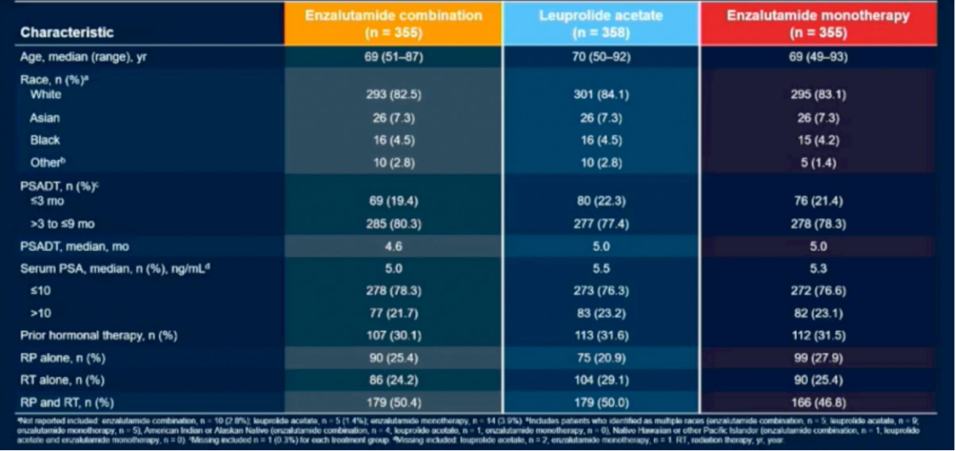 基线特征如下图所示。中位年龄约为69岁,大多数(83%)患者为白人。每组大约有20%的患者PSADT≤3个月,其余80%的患者PSADT为3—9个月。中位PSADT约为5个月。30%的患者既往接受过内分泌治疗。值得注意的是,大约一半的患者既往接受过根治术联合放疗。