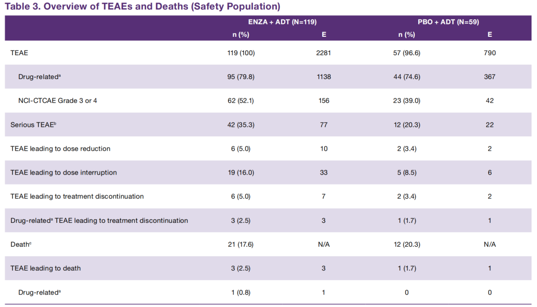 在安全方面,整体上两组的不良事件发生率非常接近,恩扎卢胺的3-4级TEAE(52.1%vs 39.0%),严重TEAE(35.3%vs 20.3%)、减剂量TEAE(5.0%vs 3.4%)、治疗中断TEAE(16.0%vs 8.5%)、停药TEAE(5.0%vs 3.4%)均表现可控或可耐受。